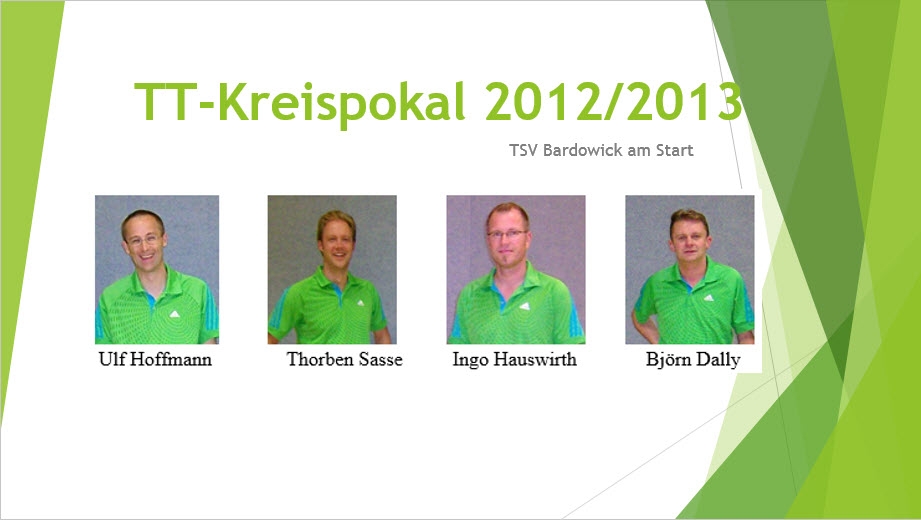 Jede Mannschaft musste in einem Spiel mit jeweils 3 Spielern antreten und es wurde jeder gegen jeder gespielt. Dabei muss man berücksichtigen, dass aufgrund der unterschiedlichen Spielstärken einzelner Spieler mit Punktvorgaben gespielt werden musste. Diese Punktvorgaben konnten bis zu 4 Punkte betragen und wenn man bedenkt dass ein Spielsatz bereits nach 11 Punkten endete dann kann man ermessen welche Anforderungen gestellt wurden. (ein Vergleich wäre etwa wenn eine Bardowicker Faustballmannschaft ihrem Gegner 4 Punkte je Satz vorgeben müsste). Und diese Punktvorgaben traf unsere Spieler fast im jeden Spiel. Viele Spiele wurden knapp und unglücklich verloren („und dann kam auch noch das Pech dazu“) Nach Niederlagen gegen den ESV II und Adendorf III konnte durch einen Sieg gegen ESV III erfreulicherweise noch der 3. Platz erreicht werden. Den Kreispokal 2012/2013 errang die Mannschaft vom ESV Lüneburg II.