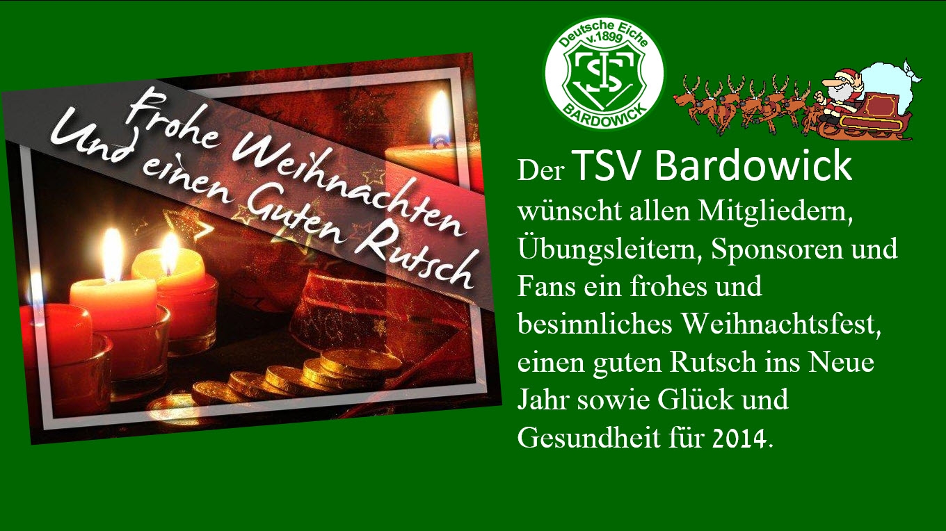 Der TSV Bardowick wünscht allen Mitgliedern, Übungsleitern, Sponsoren und Fans ein frohes und besinnliches Weihnachtsfest, einen guten Rutsch ins Neue Jahr sowie Glück und Gesundheit für 2014.