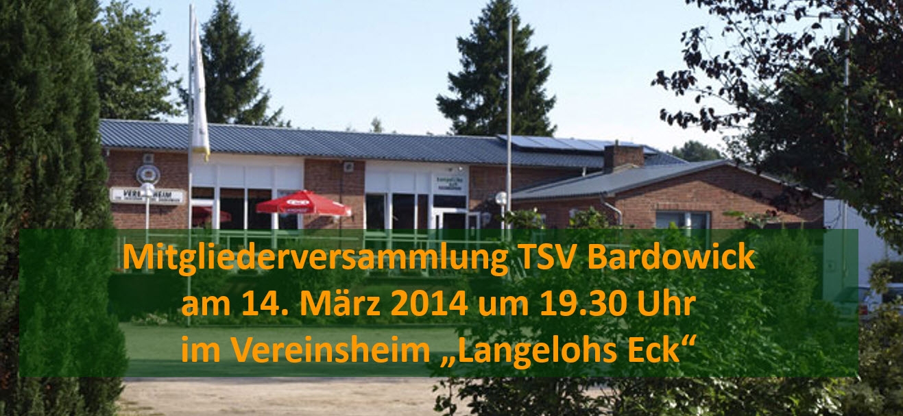 Die Mitgliederversammlung des TSV Bardowick findet am Freitag, 14. März 2014, um 19:30 Uhr im Vereinsheim Langelohs Eck statt. Der Vorstand lädt hierzu alle Vereinsmitglieder recht herzlich ein. Die offizielle Einladung mit Tagesordnung kann hier heruntergeladen werden.