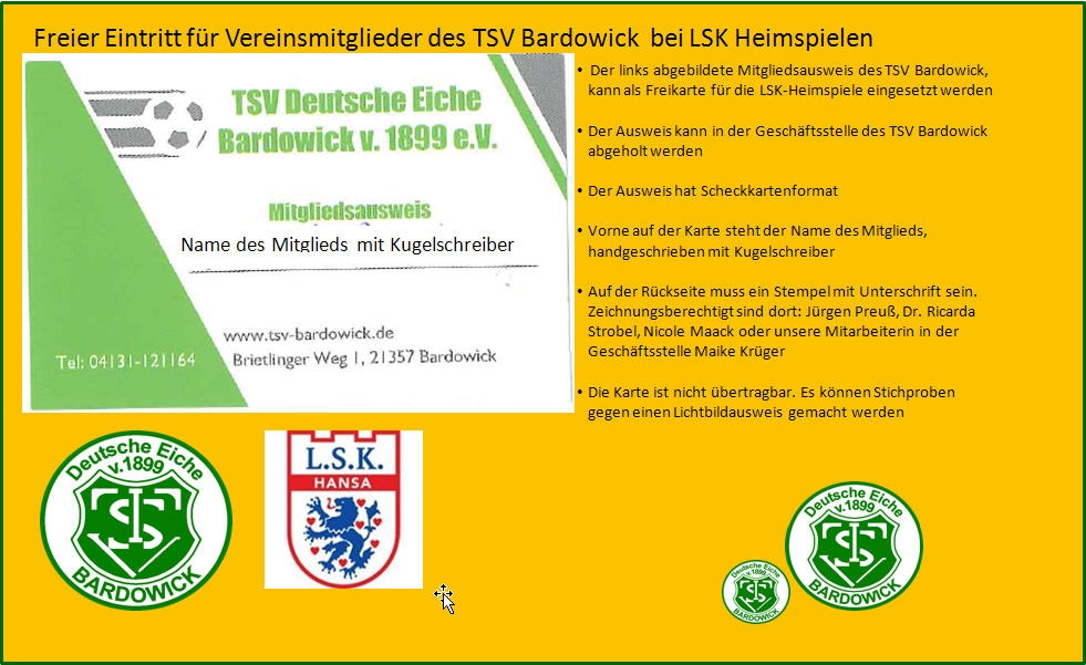 Ab dem 01.04.2014 beginnt die Zusammenarbeit zwischen dem TSV Bardowick und dem LSK mit deren 1. Herren und der A-Jugend. Wie bereits berichtet, genießen Mitglieder des TSV Bardowick und Mitglieder des Schützenvereins Bardowick freien Eintritt bei den Heimspielen des LSK. Wie erhält man jetzt konkret den freien Zugang? Der auf dem Foto links abgebildete Mitgliedsausweis des TSV Bardowick, wird als Freikarte für die LSK-Heimspiele genutzt. Der Ausweis kann in der Geschäftsstelle des TSV Bardowick abgeholt werden. Die Geschäftsstelle ist dienstags und donnerstags in der Zeit von 15.30 Uhr bis 18 Uhr besetzt. Der Ausweis hat Scheckkartenformat, vorne auf der Karte steht handgeschrieben mit Kugelschreiber der Name des Mitglieds. Auf der Rückseite muss ein TSV-Stempel mit Unterschrift sein. Zeichnungsberechtigt sind dort: Jürgen Preuß, Dr. Ricarda Strobel, Nicole Maack oder unsere Mitarbeiterin in der Geschäftsstelle Maike Krüger. Die Karte ist nicht übertragbar, es können Stichproben gegen einen Lichtbildausweis gemacht werden.