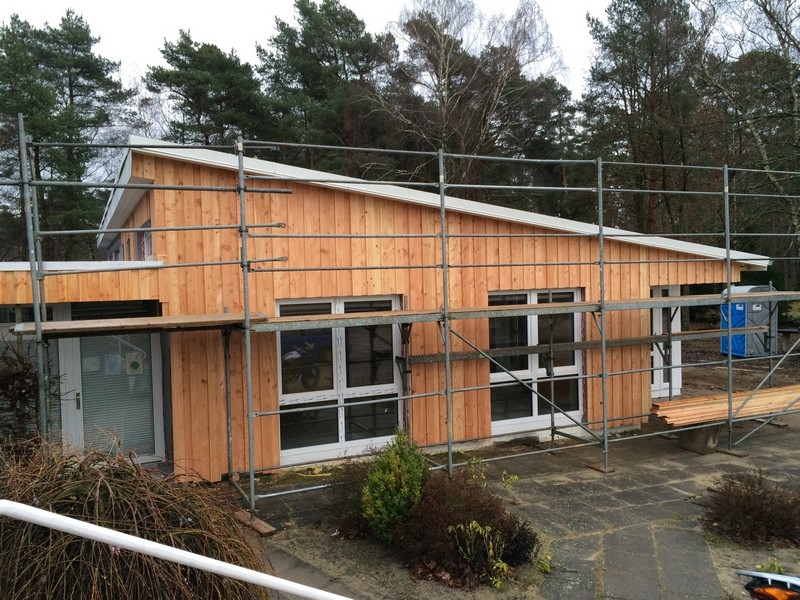 Die Bauarbeiten für unseren Sport- und Fitnessraum schreiten weiter kontinuierlich voran. Mittlerweile sind die Fenster eingesetzt, so dass man schon gar nicht mehr ohne Schlüssel in den Rohbau kommt. Die letzte alte Wand, die nicht mehr ausreichend isoliert war, bekam mittlerweile auch eine zusätzliche Dämmung und eine Holzverkleidung. Auf dem Foto sieht man die Wand noch hinter dem Baugerüst, es ist die Wand die direkt zum Parkplatz zeigt.