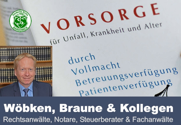 Der TSV Bardowick hat für den 11.11.2015 um 16 Uhr eine Informationsveranstaltung zum Thema „Vorsorgevollmacht“ organisiert. Der Notar Hauke Wöbken wird dann im Vereinsheim umfassend zu dem Thema informieren. Alle Interessierte sind ganz herzlich eingeladen, unabhängig davon, ob man Vereinsmitglied ist.