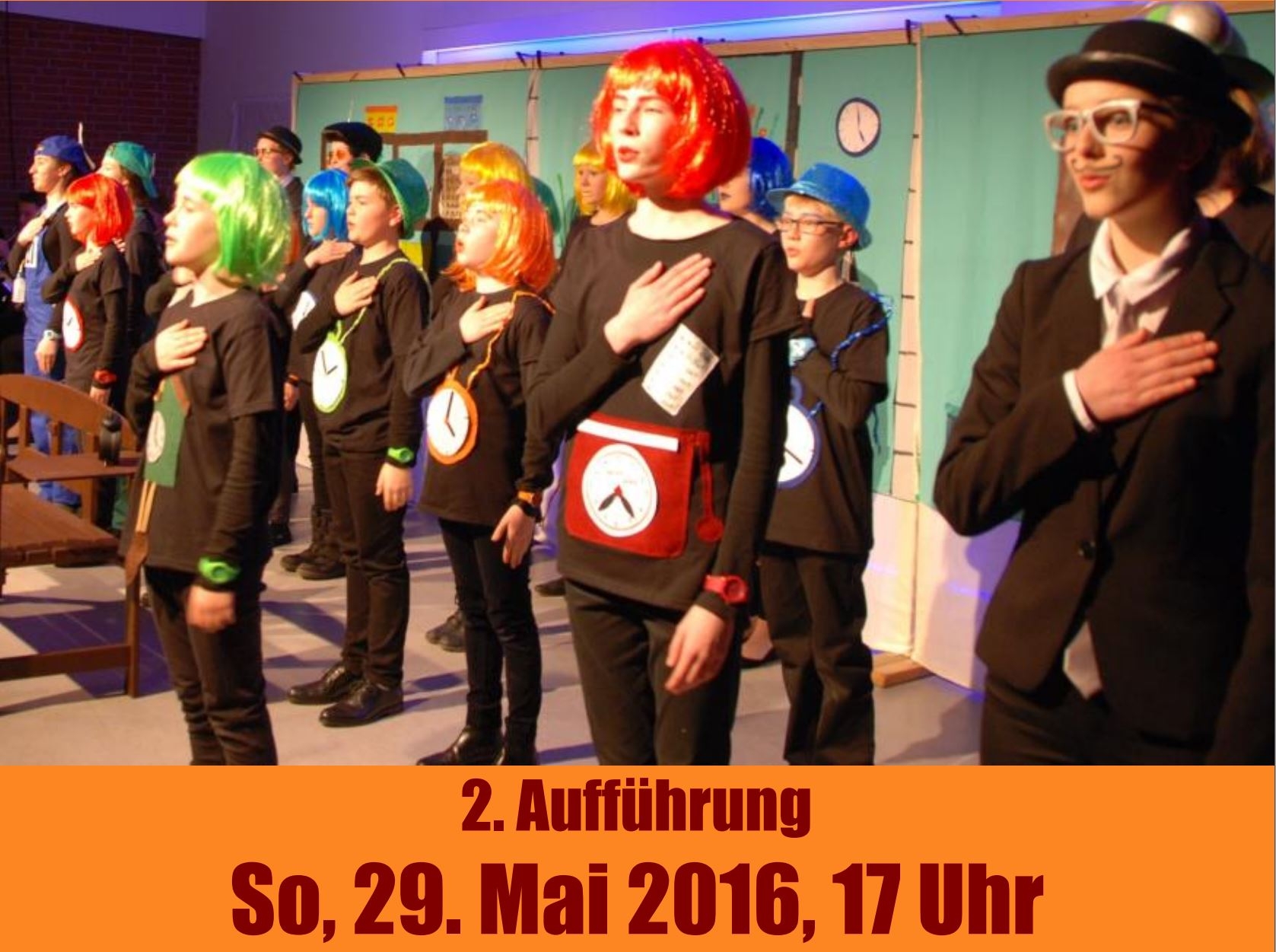 Nach dem großen Erfolg der Premiere wird es nun eine zweite Aufführung geben. „Sekunden zerhacken, Minuten zerknacken.“ Pausenlos marschieren die Uhren auf und ab, angetrieben von der Zeit bzw. von der Zeit, die sie nicht haben. Die Superuhr und ihre Gehilfen überwachen dabei die Zeit. Urlaub - abgelehnt, Kur - kannman vergessen. Aber so kann es nicht weiter gehen. Die ersten, denen ihre nervige Arbeit „auf den Wecker geht“, sind Bobby, der Aufziehwecker, und Ringo, der Radiowecker. Sie nehmen sich eine Auszeit und werden natürlich von der Superuhr und ihren Gehilfen verfolgt. Die Sonnenuhr, die als einzige die Zeit ganz entspannt sieht, versteckt die beiden. Nach und nach entdecken aber auch die anderen Uhren, dass es Wichtigeres gibt, als das ewige Gehetze im Takt der Zeit.