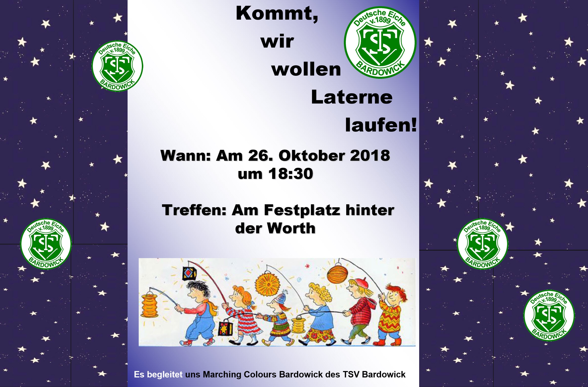 Am Freitag, 26. Oktober 2018, findet wieder unser beliebter Laternenumzug statt. Start ist um 18.30 Uhr am Festplatz "Hinter der Worth". Nach dem Umzug, der uns durch die Straßen "Im Sande", "Große Straße" und "Pieperstraße" zurück zum Festplatz führt, gibt es für alle teilnehmenden Kinder von den Organisatorinnen Natascha Burkhard und Gitta Preuß noch eine kleine Überraschung. Begleitet wird der Laternenumzug wie immer von den Marching Colours Bardowick des TSV Bardowick und der Feuerwehr Bardowick.