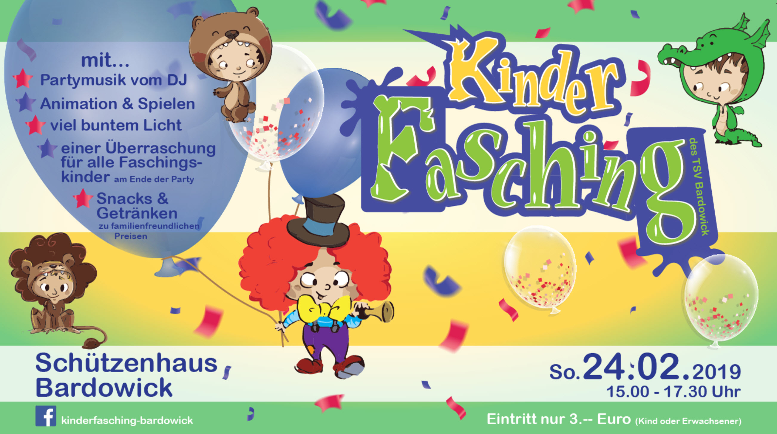 Der TSV Bardowick veranstaltet am Sonntag, 24. Februar 2019, ab 15 Uhr wieder seinen beliebten Kinderfasching. Dann können die kleinen und großen Faschings-Narren sich im Schützenhaus wieder richtig austoben.