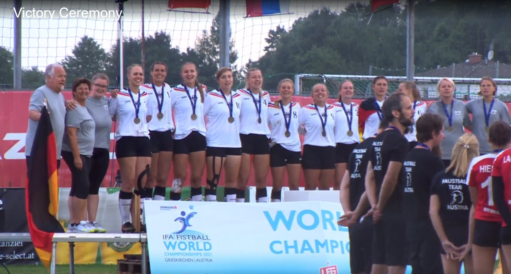 Videos Siegerehrung der Frauen Faustball WM 2021 in Grieskirchen, Österreich. Aufgenommen bei www.fistball.tv mit dem Handy vom iPad.