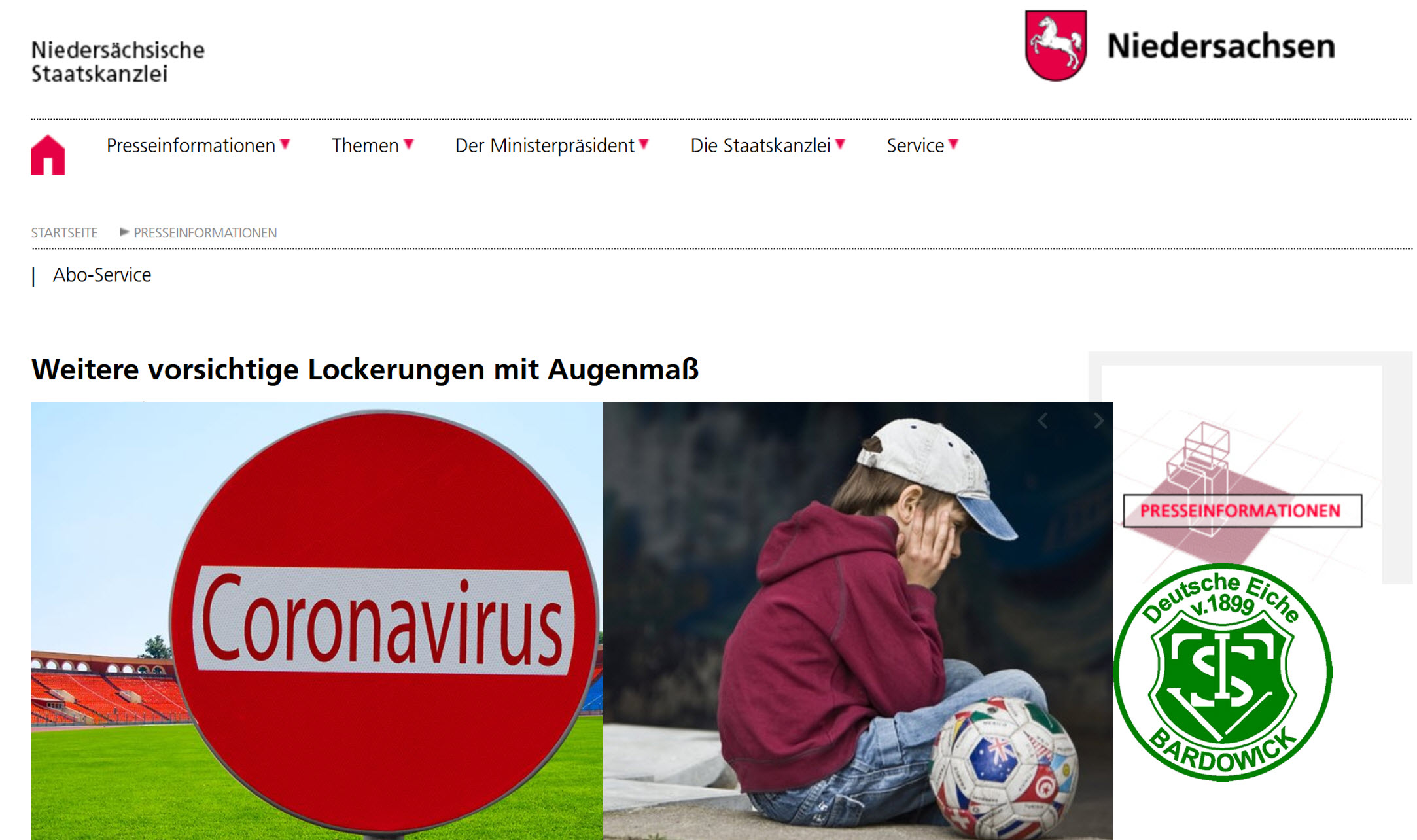 Die niedersächsische Staatskanzlei hat am 30.04.2020 eine Pressemitteilung veröffentlicht, in der auch auf die Öffnung von Sportanlagen nach den Corona-Einschränkungen eingegangen wurde. Die Pressemitteilung kann hier im Wortlaut nachgelesen werden: https://www.stk.niedersachsen.de/startseite/presseinformationen/weitere-vorsichtige-lockerungen-mit-augenmass-187982.html