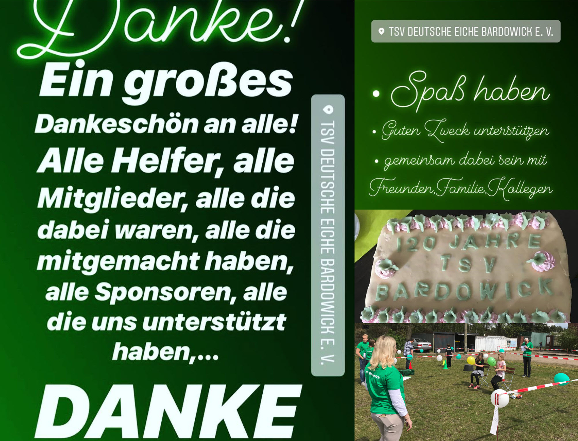Das Spiel- und Sportfest zum 120-jährigen Jubiläum des TSV Bardowick am 27.04.2019 war ein großer Erfolg. Viele Familien fanden den Weg auf die Sportanlage und nahmen die verschiedenen Spielstationen und zahlreichen Angebote sehr gut an. Es wurde gelaufen, Handball, Faustball und Fußball mal nicht in Wettkampfform gespielt, es konnte beim Tennis, LNB und beim Powerdance geschnuppert werden. In der Cafeteria gab es durch zahlreiche Kuchen- und Tortenspenden ein vielfältiges Angebot und auf dem Grillplatz war ebenfalls ständig Betrieb. Der Getränkestand war gut besucht und wurde für die Kinder durch Slush-Eis veredelt. Auf der Terrasse wurde das Glücksrad ständig gedreht und überall gab es kleine Überraschungen. Neben der Moderation durch unseren Kalle Krappel präsentierten sich auch die Marching Colours des TSV Bardowick und sorgten mit ihrer Musik für gute Stimmung. Alles in allem war es ein super gelungener Nachmittag, die zahlreichen positiven Rückmeldungen von vielen Teilnehmern bestätigen dies. Der Verein konnte sich in seiner ganzen Vielfalt hervorragend präsentieren.